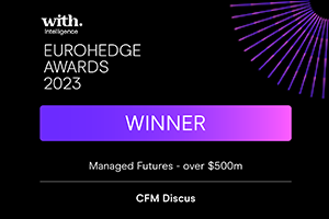 We are delighted that CFM’s Discus investment strategy has won the Managed Futures over $500M award at the EuroHedge Awards 2023 on 29th February. This award is based on performance over 12 months from January to December 2023. Many thanks to all at CFM for the dedication and focus that leads to awards, and congratulations to the other winners on the evening. More details here https://awards.withintelligence.com/eurohedgeawards/en/page/2023-winners