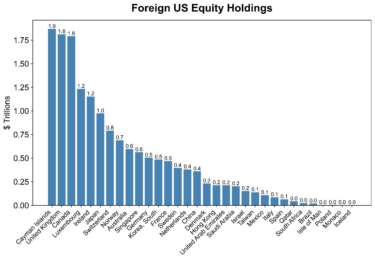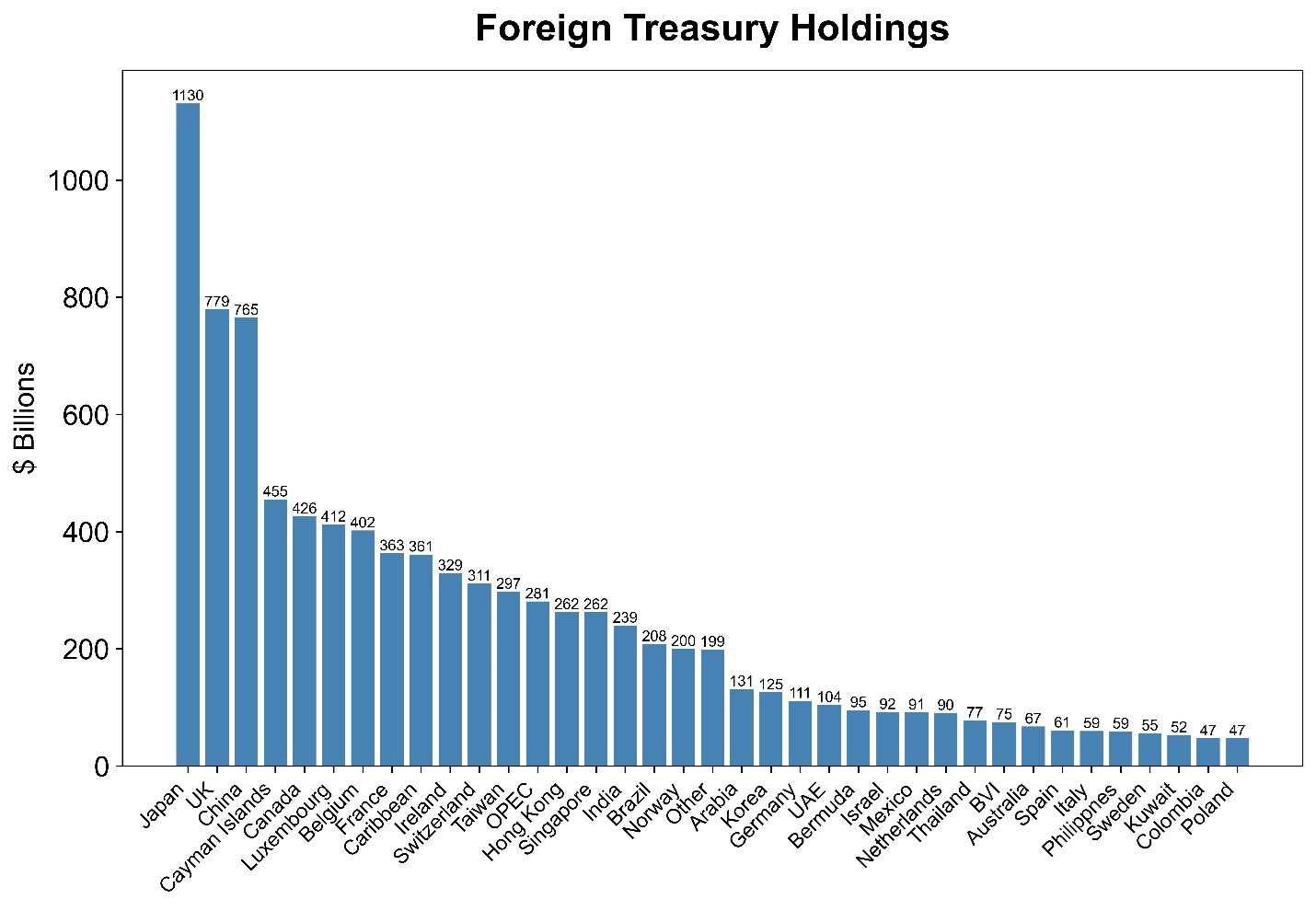 In Figure 3 we show the largest foreign holders of US Treasuries. The largest holders include: (i) countries with well-developed savings schemes but smaller domestic markets incapable of absorbing these savings, (e.g. Canada & Australia); (ii) countries with a large US trading relationship which recycle excess savings to the US (e.g. China); and (iii) open economies with large financial sectors (e.g. UK, Switzerland).