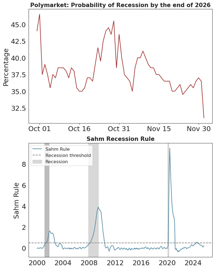 Betting markets price the odds of a US recession by the end of 2026 at 32%39 and during a recent interview, the Treasury Secretary said40 that he believes several sectors are already in recession. Indeed, excluding the healthcare sector, payroll growth has been flat or negative in the last three payroll reports. AI is also playing a key role in labor market weakness, firms either believe AI will lead to large productivity gains reducing demand for labor or are using the narrative as cover to reduce bloated headcounts. We also show the Sahm rule which has a reasonable track record of predicting recessions. The measure is drifting higher towards the threshold but suggests a recession in the US is not imminent.