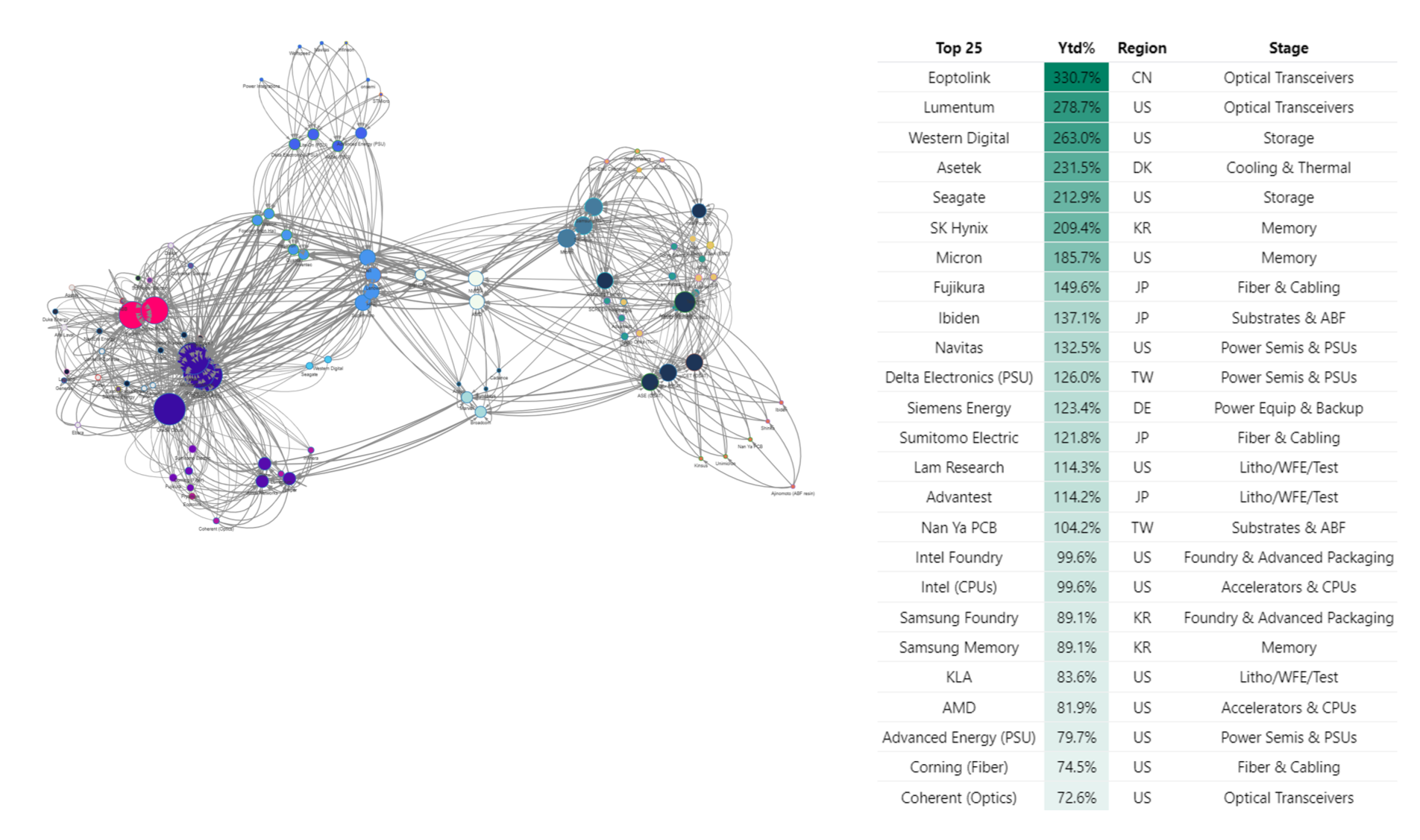 In addition to the US, equities linked to the build out in Europe, China, Taiwan, Korea and Japan have benefitted. In Figure 3 we show the linkages in demand and supply chains across 92 firms that are contributing to the AI buildout. We also show year-to-date performance for the top 25 names in the network. AI linked equities have outperformed.