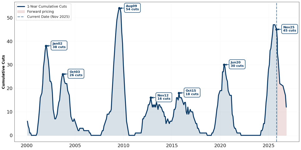 The easing is happening with equities at record highs, credit at record tights and a performing economy with real growth around 2%, unemployment at 4% and inflation running around 3%. Broadly, this is a positive tailwind for global risk assets. As shown in Figure 4, our basket of central banks is priced for 17 cuts over 2026, lower than the number of cuts realized over the last year, suggesting relatively less easing for 2026.