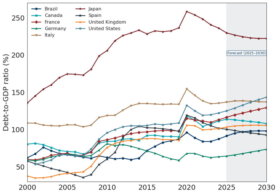 The fiscal playbook pioneered by the United States during the President’s first term and continued in the second has been copied by several countries. For example, the United Kingdom, France, Germany23, Japan and Canada are all looking at opening the fiscal gates. Politicians argue fiscal expansion works by growing the economy faster than the cost of debt which de-leverages an economy’s balance sheet over time. It remains unclear whether this policy mix will be successful. Countries with lower overall debt burdens like Germany have better odds or AI might deliver large productivity gains allowing economies to grow and de-leverage simultaneously. In the short term, fiscal expansion and de-regulation efforts benefit equities and increase yields, a dynamic playing out in Germany and Japan where newly elected leaders commit to expansionary fiscal policies.
