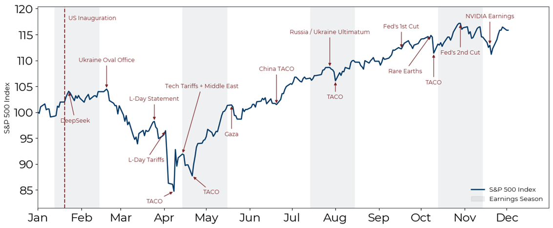President Trump’s liberation day announcement caught the market offside. Tariff rates came higher and broader than expected, triggering risk-off price action and large position reduction. The President and his inner circle call it ‘maximizing strategic uncertainty’ or the use of initial, aggressive demands in negotiations then walking the terms back when unfavorable reactions manifest. The rapid escalations and walk backs on unpredictable time scales made volatility forecasting more challenging in 2025. Markets briefly entertained the end of US exceptionalism in response to the Liberation Day tariffs but ultimately looked through the event as the President strategically walked back his threats while fundamentals remained strong over 2025.