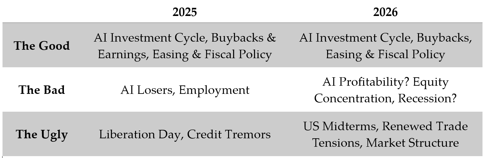 As year-end approaches we review what transpired in markets over 2025, highlighting “The Good, The Bad & The Ugly”. Sticking with our Sergio Leone inspiration, we do a similar exercise for 2026. For readers, we provide a short recap of 2025 and expectations into 2026 followed by an in-depth discussion.