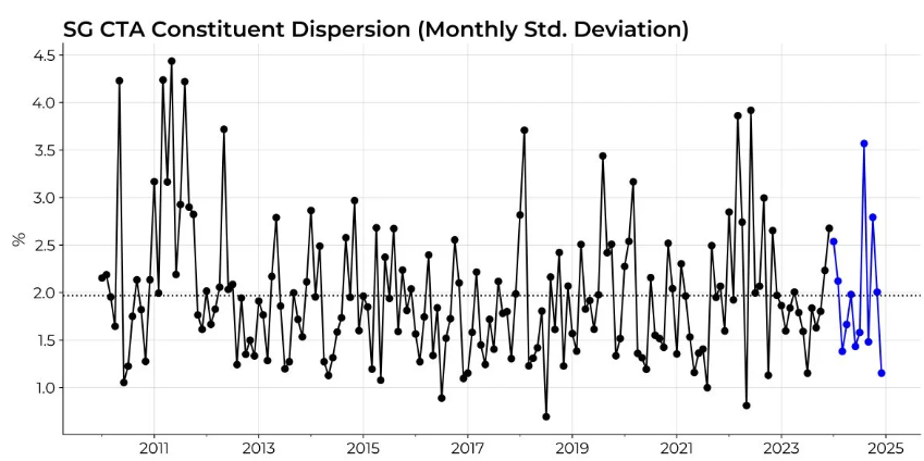We remain somewhat dismayed by the often-stated opinion that the dispersion of individual CTA performance is currently high or even increasing. We’ve heard chatter that this dispersion was particularly acute in 2024. This bias that a regime shift is always afoot is strong.