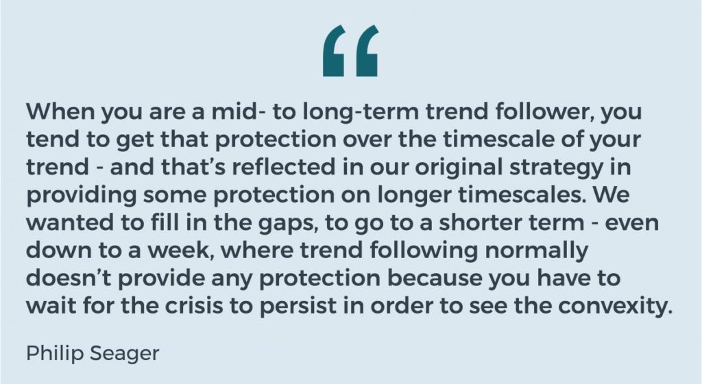 We set out to build a strategy that offers downside equity protection on a range of timescales. That means you’re looking at the performance of your program in the context of it being affected by a sizeable downside move over a timescale of a year, six months, a quarter, a month, and a week. When you are a mid- to long-term trend follower, you tend to get that protection over the timescale of your trend – and that’s reflected in our original strategy in providing some protection on longer timescales. We wanted to fill in the gaps, to go to a shorter term – even down to a week, where trend following normally doesn’t provide any protection because you have to wait for the crisis to persist in order to see the convexity.